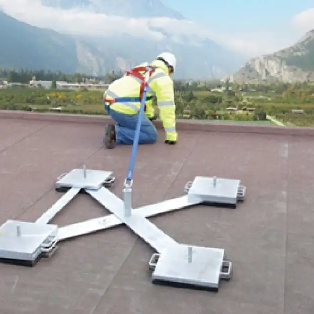 portable roof man anchor device for use on roofs of up to 5 degrees pitch, where the absence of guardrails or permanent anchor devices would otherwise preclude safe means of access.