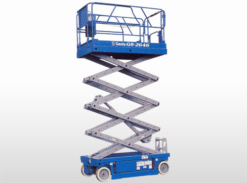 Genie GS2646 electric scissor lift with a working height of 9.92m. This electric scissor can lift two people with equipment when working indoors or outside, making it a flexible addition to any fleet. The GS2646 balances durability with excellent performance and ease of use. Maintenance is kept simple and straightforward thanks to swing-out trays and on-board diagnostics.