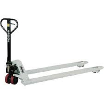 Heavy duty, extended fork manual pallet truck for use in warehouses, factories and shops.