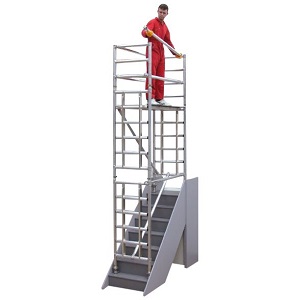 Stairdeck uses a patented, movable ladder frame, enabling the user to safely enter the tower directly from the stairwell. Climbing to the working platform can then be done from the interior of the tower structure, as recommended by all Health & Safety committees.